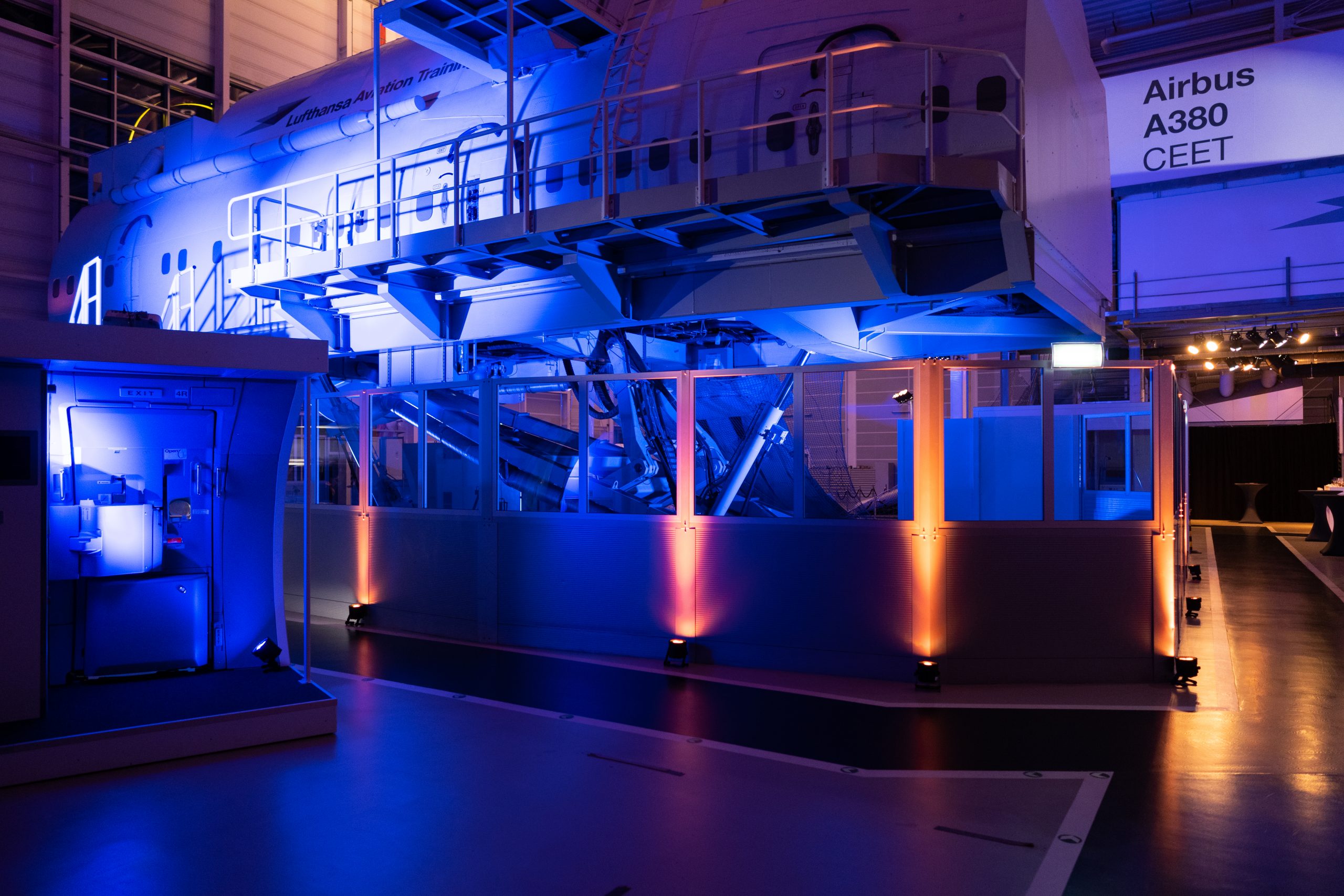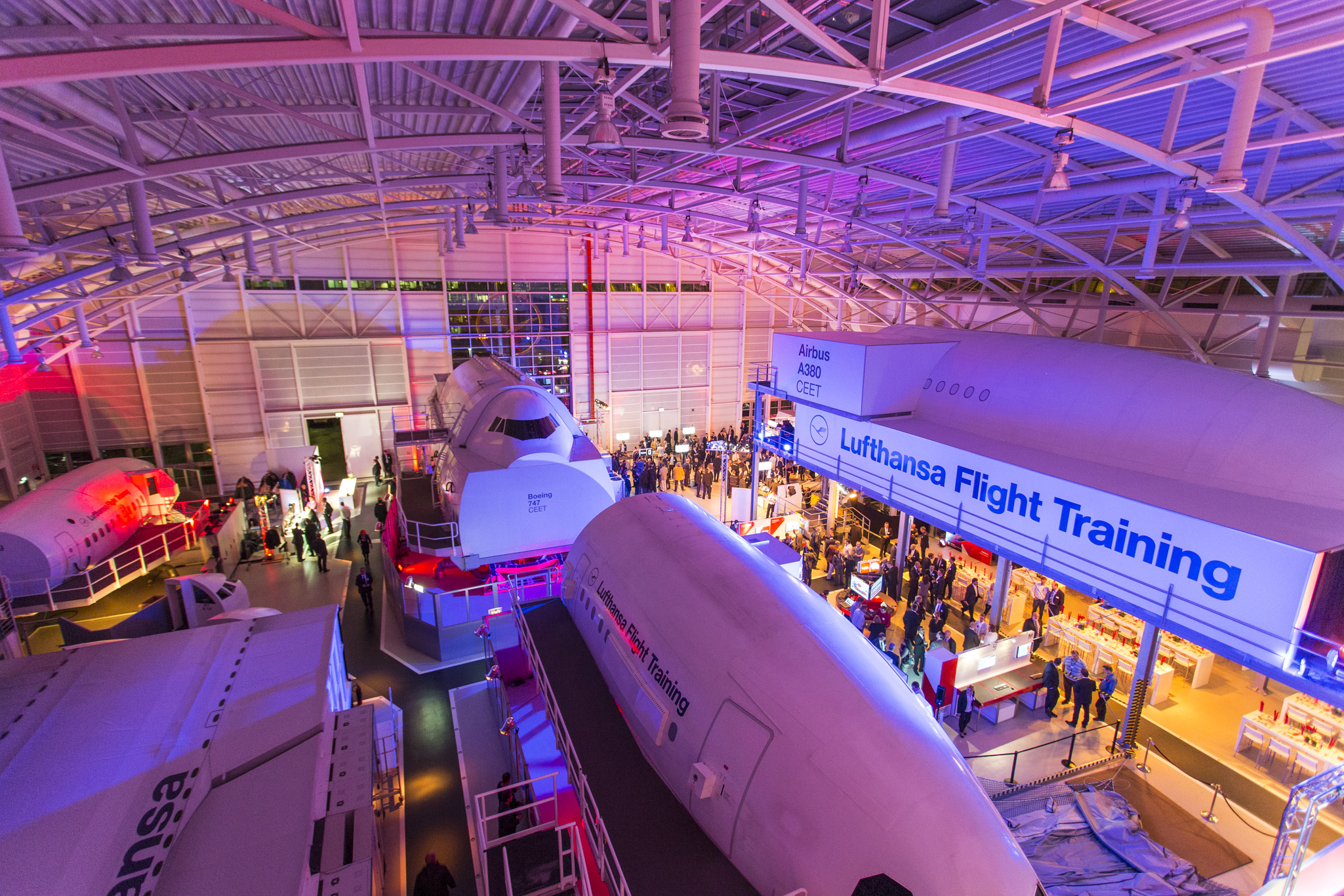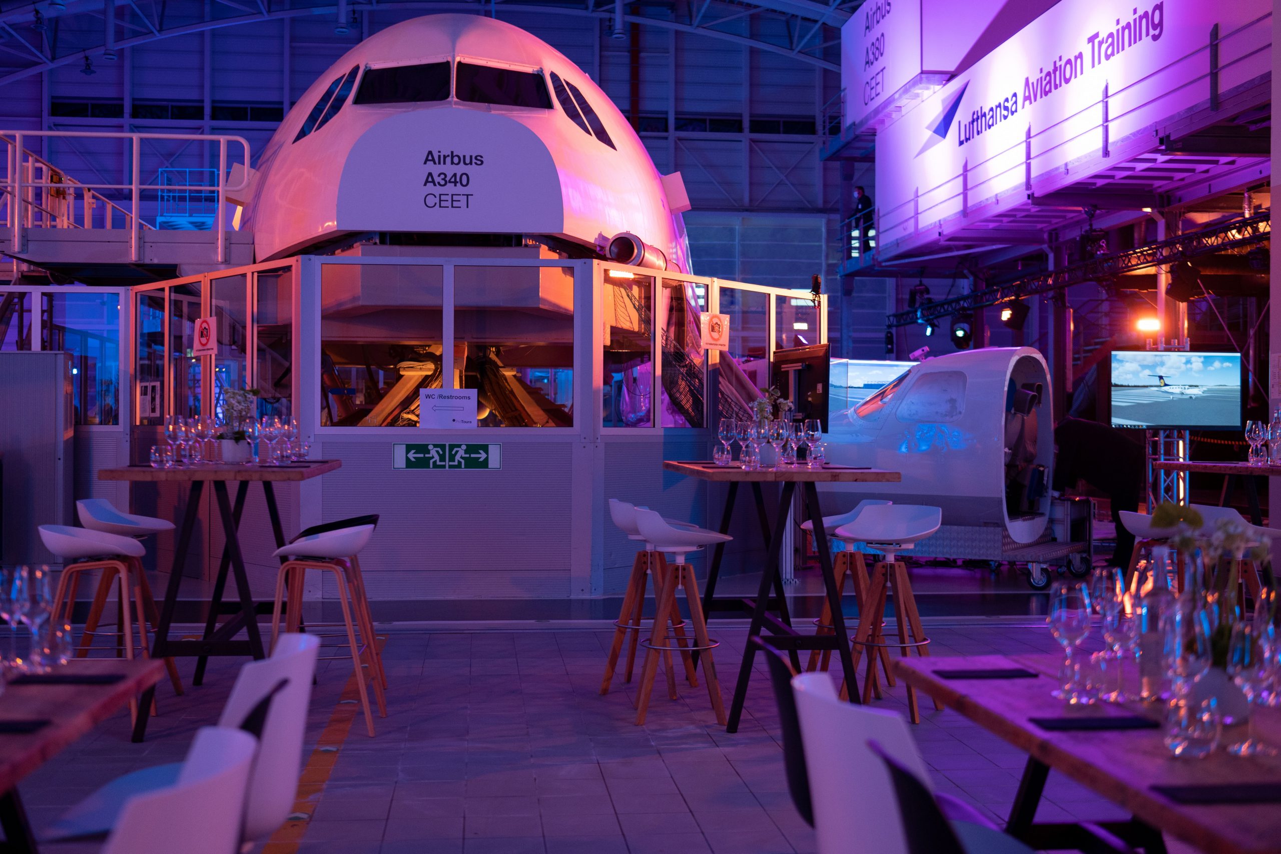 Ihnen alles, um Ihre Kunden und Mitarbeiter nachhaltig zu begeistern. Die Simulatorhalle ist das Herzstück des LATC. Mit einer Mischbestuhlung bietet sie Platz für bis zu 400 Personen. Beeindruckende Kabinen-Simulatoren sorgen für eine atemberaubende Kulisse. Stimmungsvoll beleuchtet, setzt die Simulatorhalle Ihr Unternehmen perfekt in Szene. Sogar der Pool, der sonst für Notwasserungsübungen genutzt wird, kann in Ihre Inszenierung mit einbezogen werden.